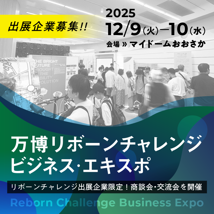 ゾーンの名称にもなっている「リボーンチャレンジ」とは、万博への参加をめざす、優れた中小企業・スタートアップを発掘し、大阪ヘルスケアパビリオンでその象徴的な成果を効果的に発信できるよう、万博会期中だけでなく、準備期間や開催後も視野に入れた支援事業企画を表します。